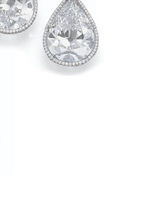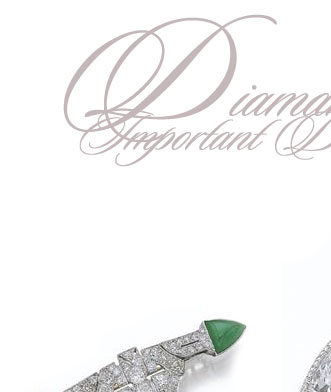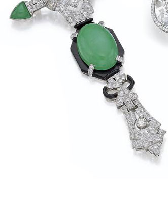 Designed as a looped line of circular-cut diamonds terminating at each end with a tassel of single-cut diamonds, supporting at the centre a brilliant-cut diamond weighing approximately 2.10 carats and a carved emerald drop depicting a female profile studded with rubies, the rest of the diamonds weighing approximately 6.00 carats in total.