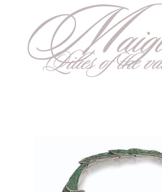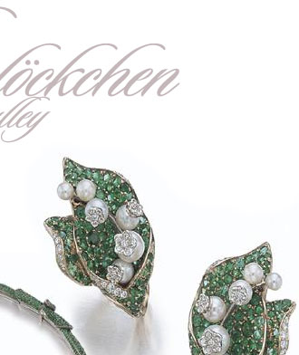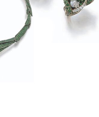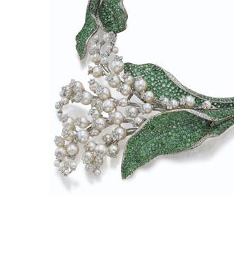 - The "Diorissimo" necklace made by Victoire de Castellane for Christian Dior. A realistic representation of a spray of lilies of the valley, this very beautiful piece of jewellery is decorated at the front with cultured pearl and diamond set flowers, while the leaves are pavé set with emeralds weighing a total of 85.00 carats. The originality of this necklace, which pays tribute to Christian Dior--the lily of the valley was his favourite flower and is a symbol of the House of Dior--is underlined by the small diamond bee nestling just inside the back of the necklace