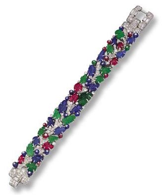 The principal designers at Cartier, Jacqueau in Paris and Genaille in New York, managed to crystallize in their jewels the seemingly light airiness of delicate platinum workmanship with the floral themes that represent the fusion of Persian and Indian decorative motifs that define Mogul design. The stones they used in the pieces of this period were cut and engraved in naturalistic leaf, flower and berry shapes, seemingly attached to a pavé diamond stem, with diamonds inset into some of the "berries" as well as collet-set as accents. Known popularly as "fruit salad" and "tutti frutti," these jewels reflect the pursuit of the exotic that so captivated the sophisticated European and American collectors of the 1920's and 1930's.
