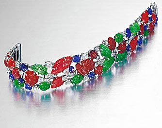 2002 Sotheby's auctioned of 933,500 USD for the carved, coloured stone and diamond 'tutti-frutti' bracelet by Cartier (above left) confirmed today's appreciation of jewellery as art, and also confirmed this Indian-inspired design as a classic.Examples of the firm of Cartier's introduction of Indian motifs into Western jewellery design abound. Jacques Cartier's fascination with India resulted from the choice of the Parisian firm by India's princely families following the celebration of George V's coronation at the Delhi Durbar in 1911 to rework their jewels into what they perceived as more fashionable European styles. Cartier travelled to India that year, a distinctive influence that would inspire Cartier to new heights of creativity in the art of jewellery design. The colourful enamel work of Jaipur, Benares and Lucknow was mirrored in the juxtaposition of coral, black enamel and coloured stones in Cartier jewels of the Art Deco period. The traditional paisley motif from the sarpech and the hanging turah, both Indian turban ornaments, were incorporated into Cartier's version of the aigrette, as well as lapel and hat brooches, and the tassel pendant. The choker-like guluband and rigid collar necklace, hasli, were translated into stunning gem-set necklaces and bracelets.