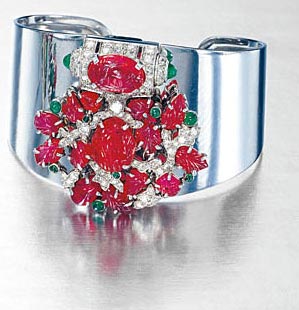 Charlton & Co, the American jewellery house is represented by a rare beautiful diamond-, emerald- and ruby-set bracelet of spring-like foliate design1930S